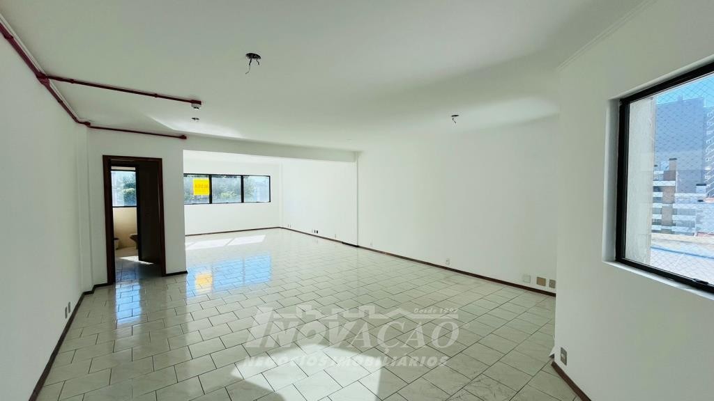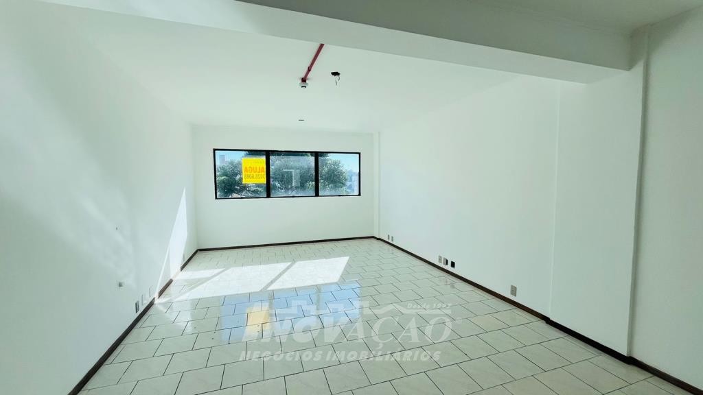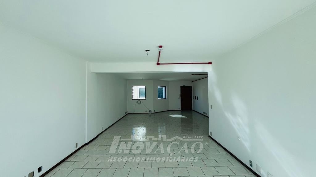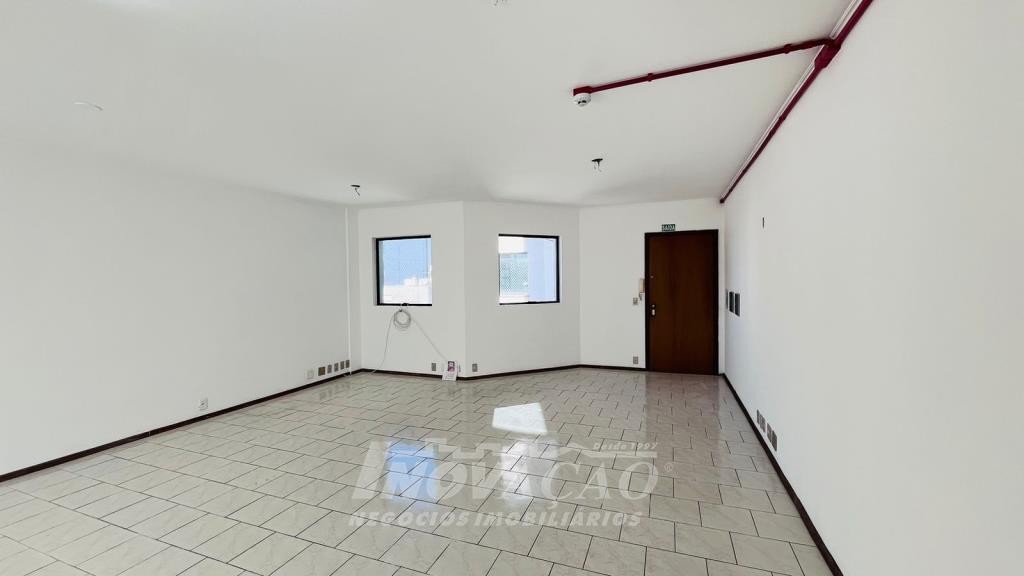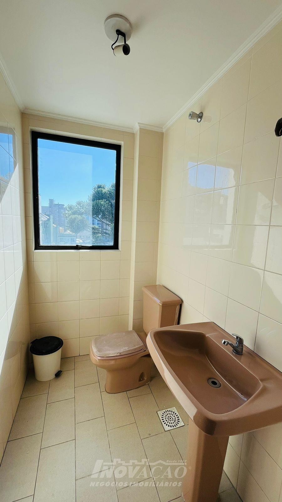 Sala comercial aérea de 79,90m², com banheiro e piso cerâmico.