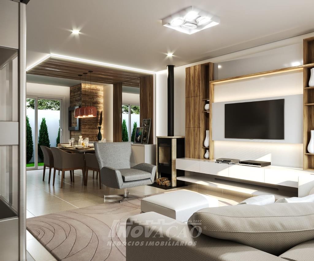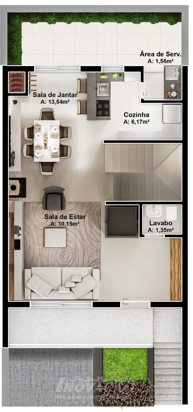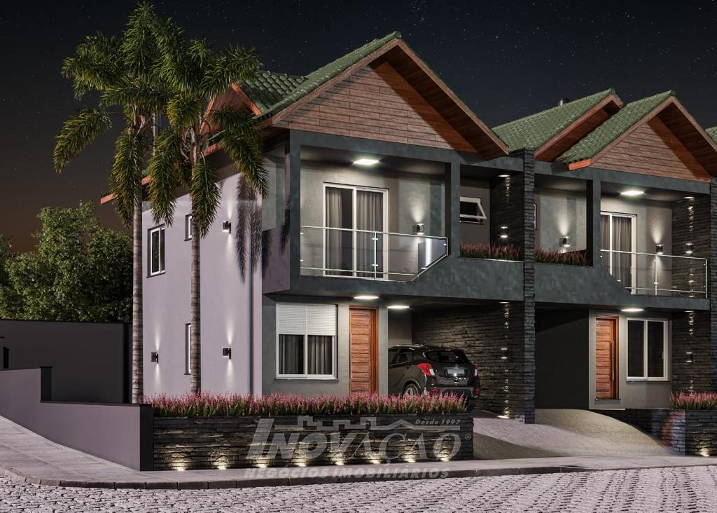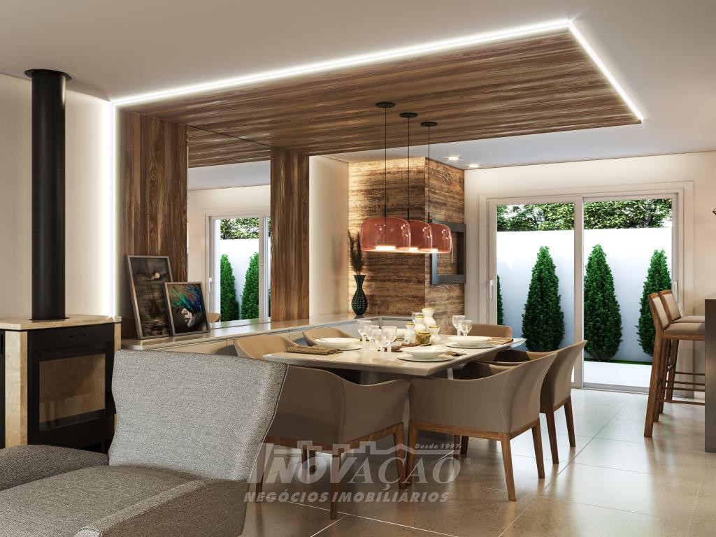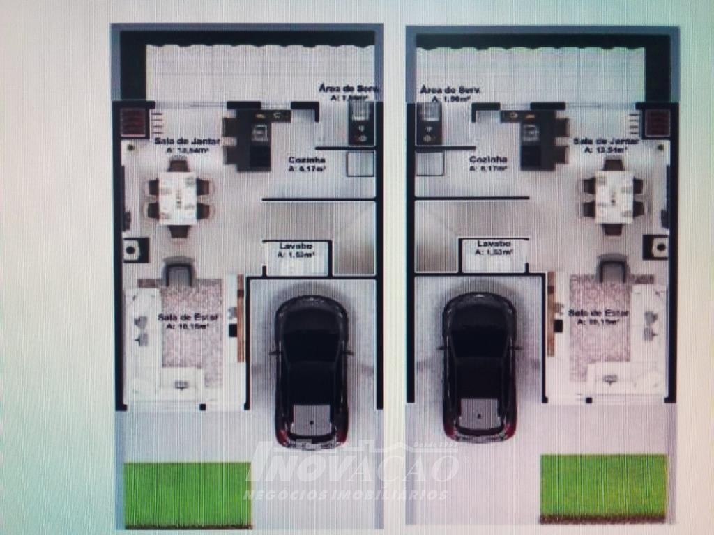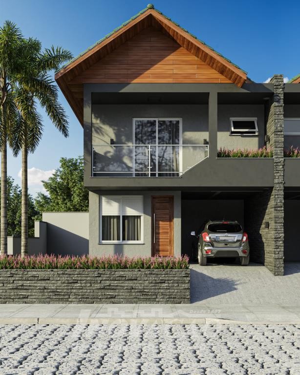 Sobrado com frente individual: Parte inferior com sala de estar e jantar com churrasqueira, cozinha r área de serviço divididas com gesso acartonado, piso em porcelanato, lavabo, varanda com 12 m², pátio frontal com 12 m², esquadrias de alumínio, massa corrida, espera pra split, espera pra carregador de carro elétrico, espera pra lareira calefator, espera pra sistema fotovoltaico, varanda, pátio frontal, garagem para um automóvel. Parte superior com dois dormitórios sendo um suíte com sacada, o dormitório de solteiro amplo podendo transformar em dois dormitórios ou home office, posição solar noroeste.