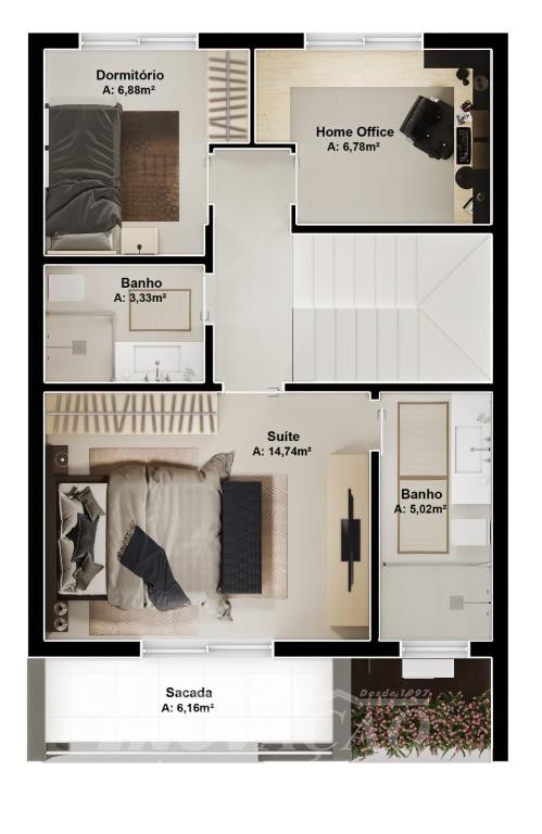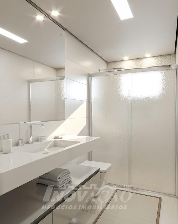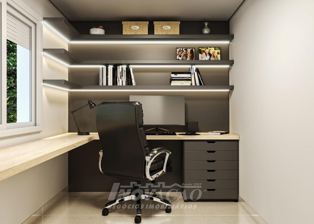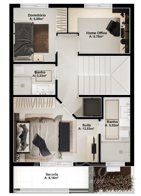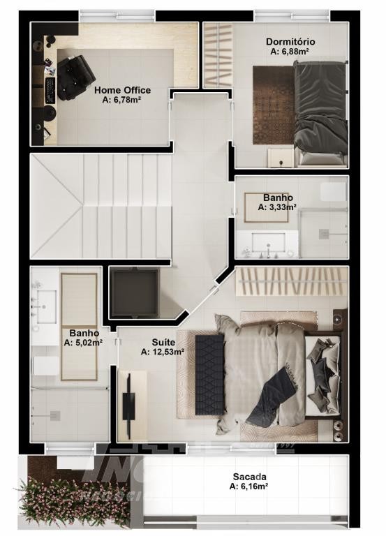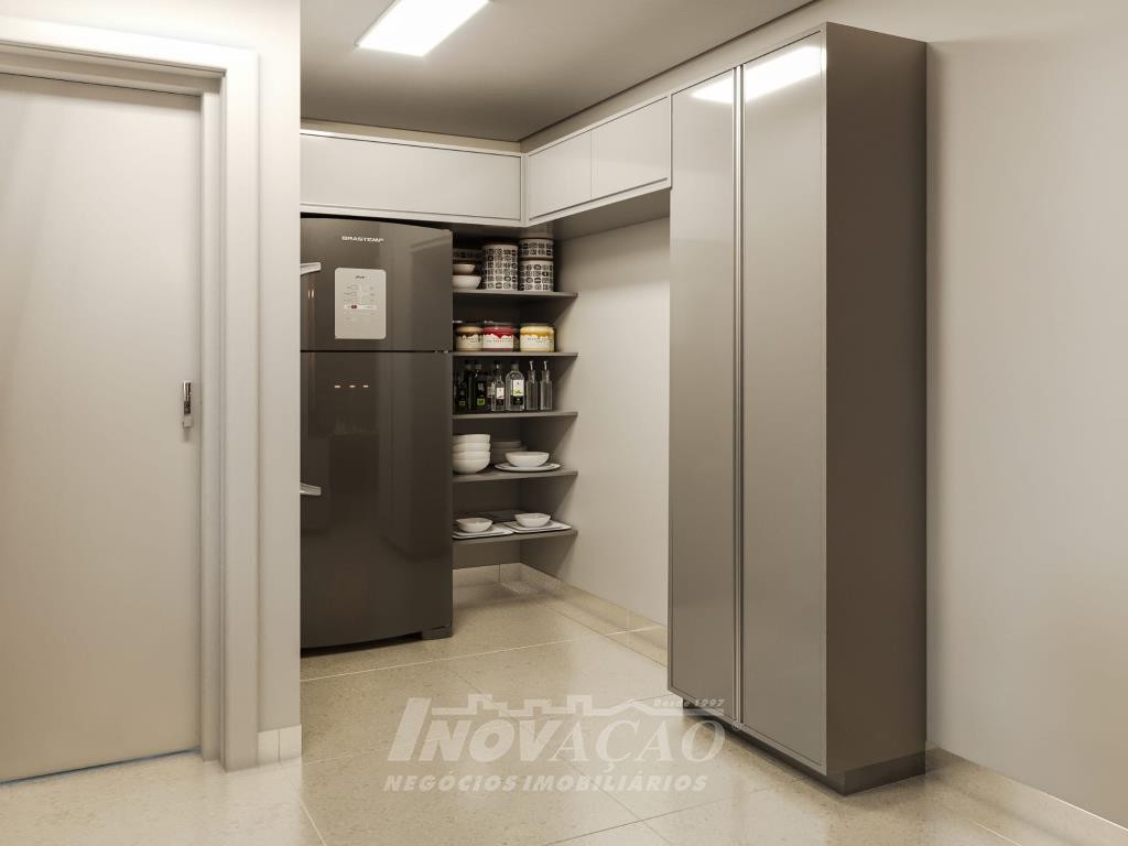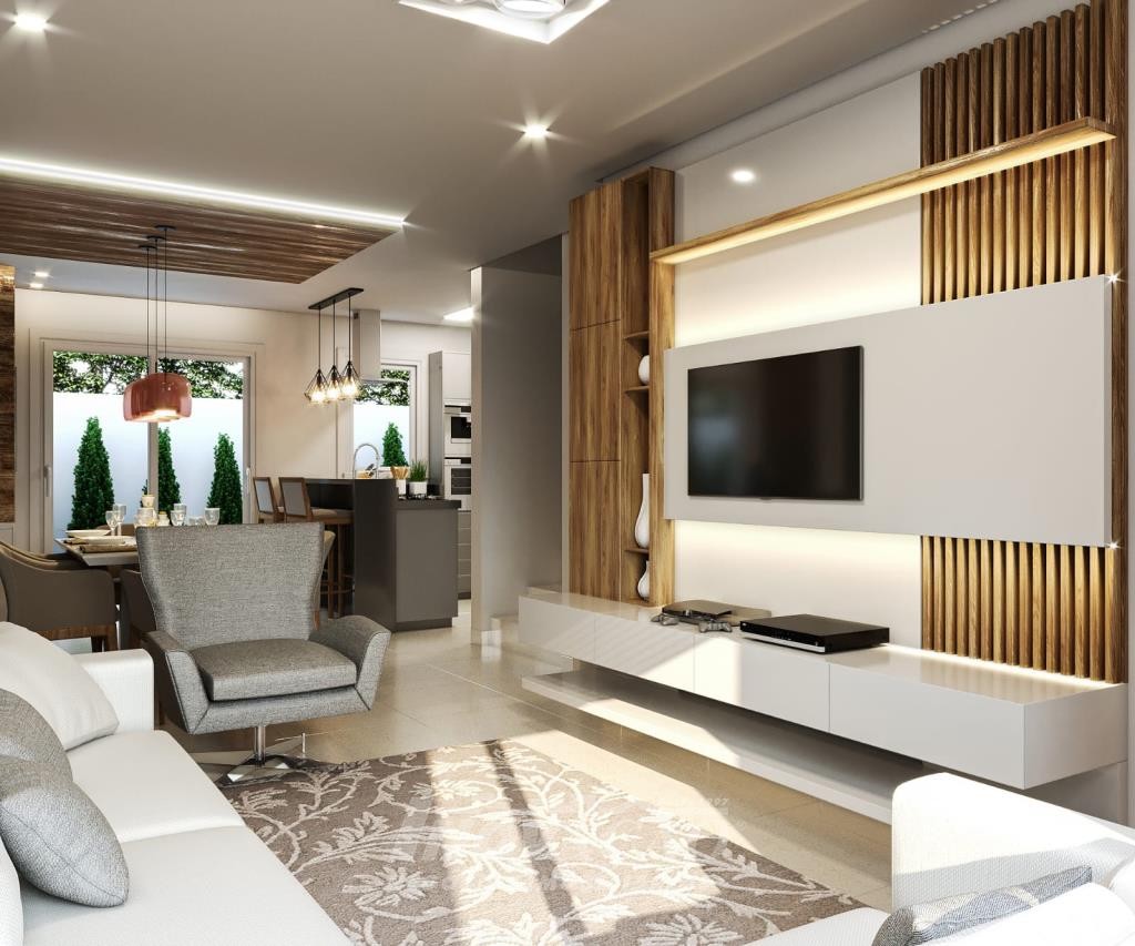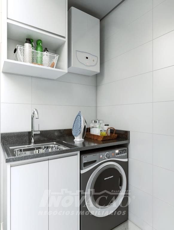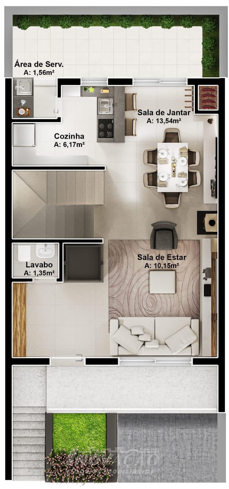 Sobrado com frente individual: Parte inferior com sala de estar e jantar com churrasqueira, cozinha r área de serviço divididas com gesso acartonado, piso em porcelanato, lavabo, varanda com 12 m², pátio frontal com 12 m², esquadrias de alumínio, massa corrida, espera pra split, espera pra carregador de carro elétrico, espera pra lareira calefator, espera pra sistema fotovoltaico, varanda, pátio frontal, garagem para um automóvel. Parte superior com dois dormitórios sendo um suíte com sacada, o dormitório de solteiro amplo podendo transformar em dois dormitórios ou home office, posição solar noroeste.