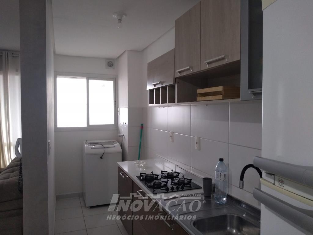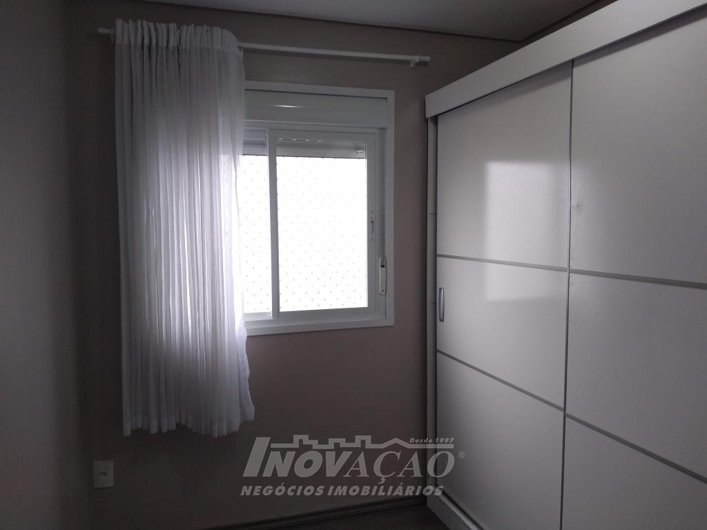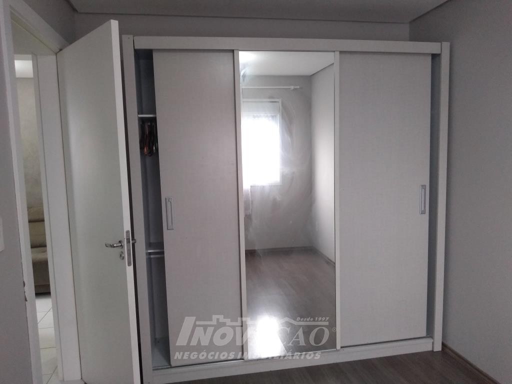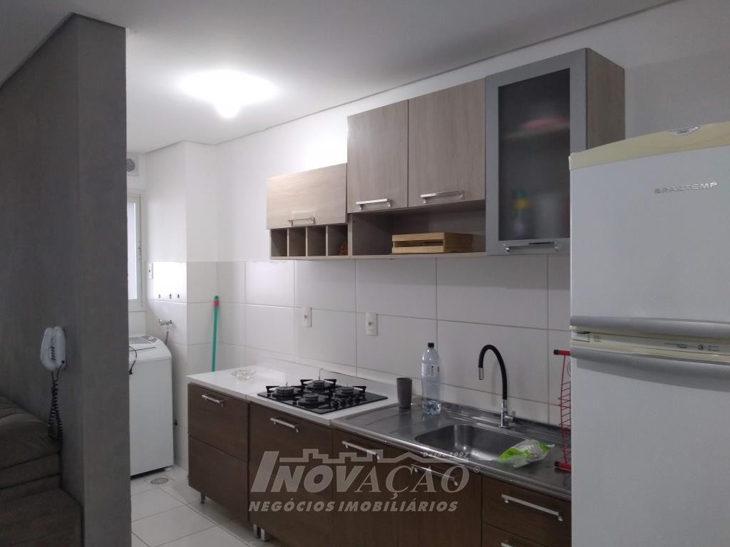 Inovação Negócios Imobiliários vende em Caxias do Sul, RS, no bairro Desvio Rizzo, apartamento mobiliado com dois dormitórios, sala, cozinha, banheiro social, área de serviço, sacada fechada com churrasqueira, uma vaga de garagem. A posição solar é sul.