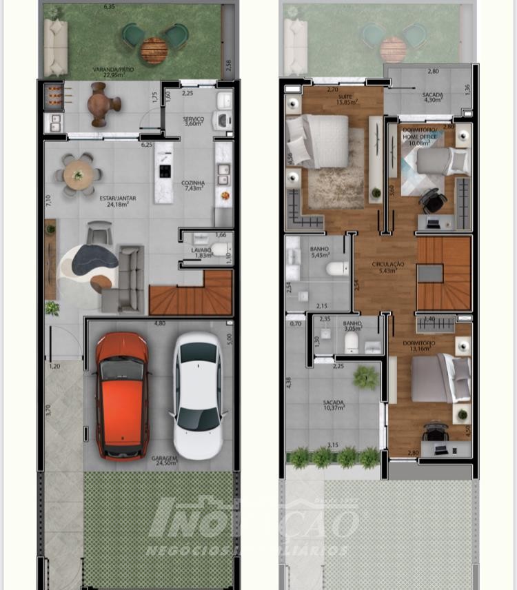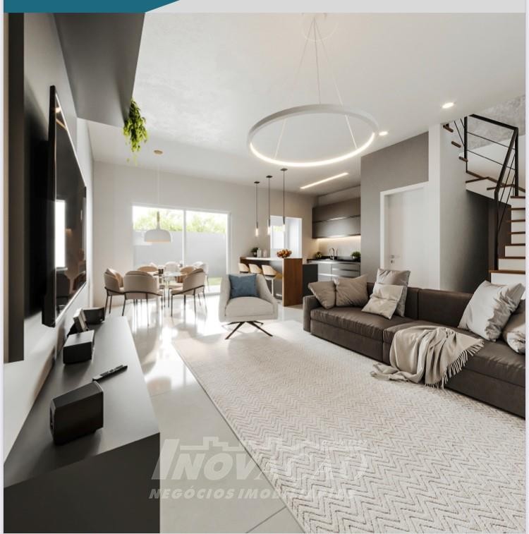 Inovação Negócios Imobiliários, vende em Caxias do Sul, bairro Sagrada Família, sobrado com três dormitórios, sendo um suíte ampla com sacada, sacadas nos demais dormitórios, lavabo no térreo e banheiro social no andar superior, esquadrias em pvc, com espera para vidro duplo nos dormitórios, piso porcelanato no living, cozinha, área de serviço e banheiros, piso laminado flutuante nos dormitórios, sala de estar e jantar e cozinha integrados, gesso rebaixado, sacada com peitoril de vidro, garagem para dois carros e espaço para carro adicional, espera para água quente, espera para split. Churrasqueira, pátio com espera para depósito.