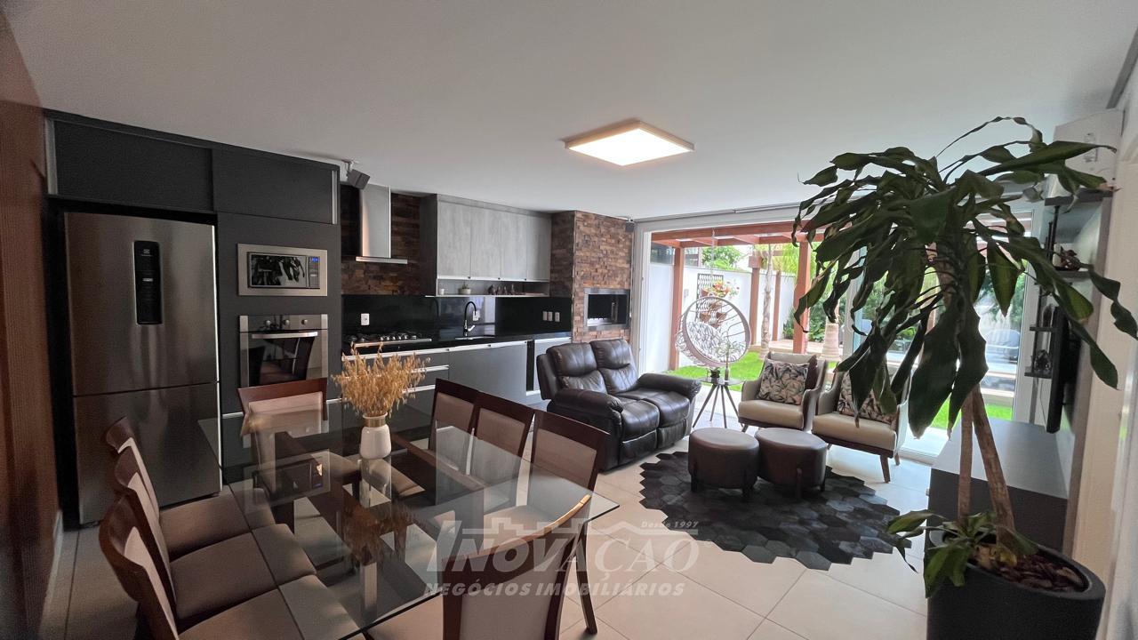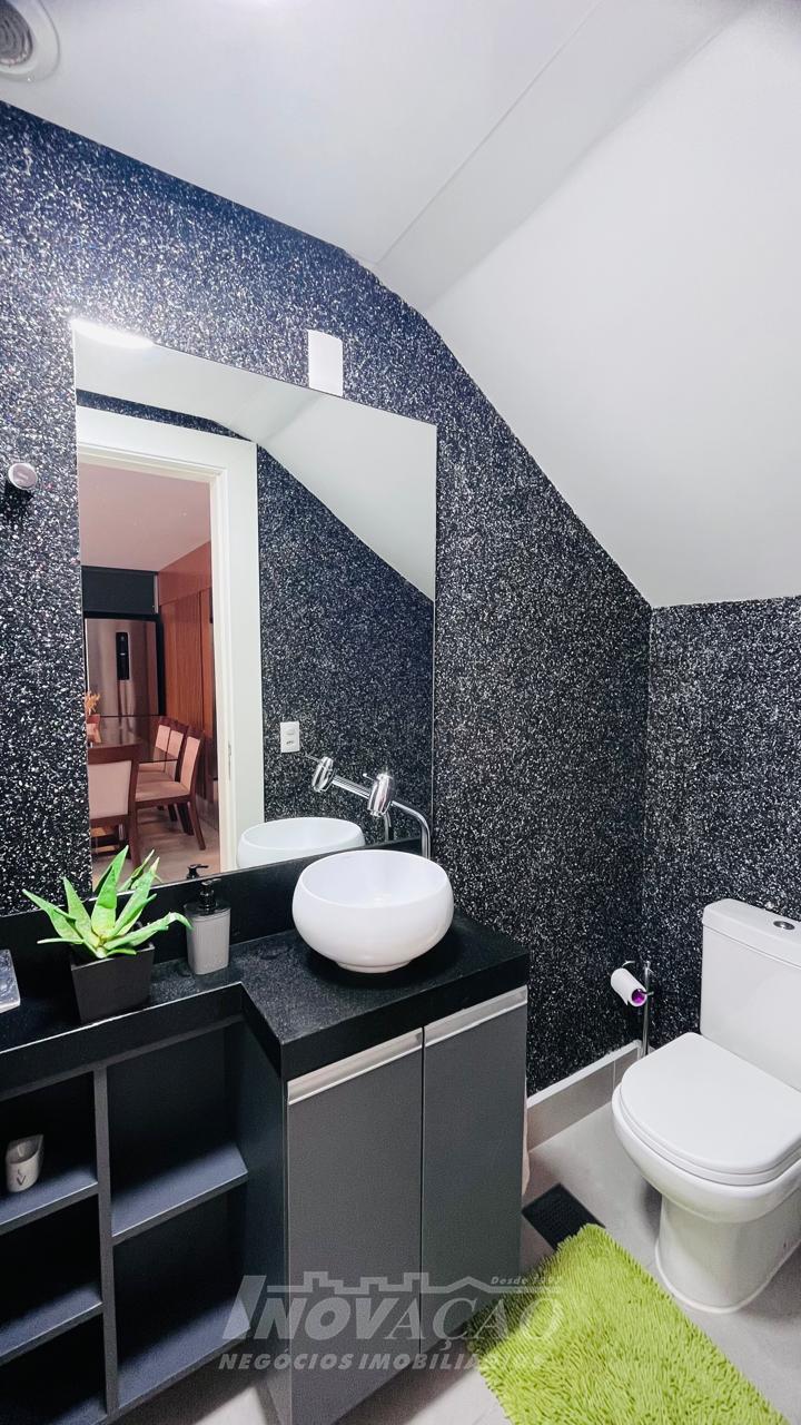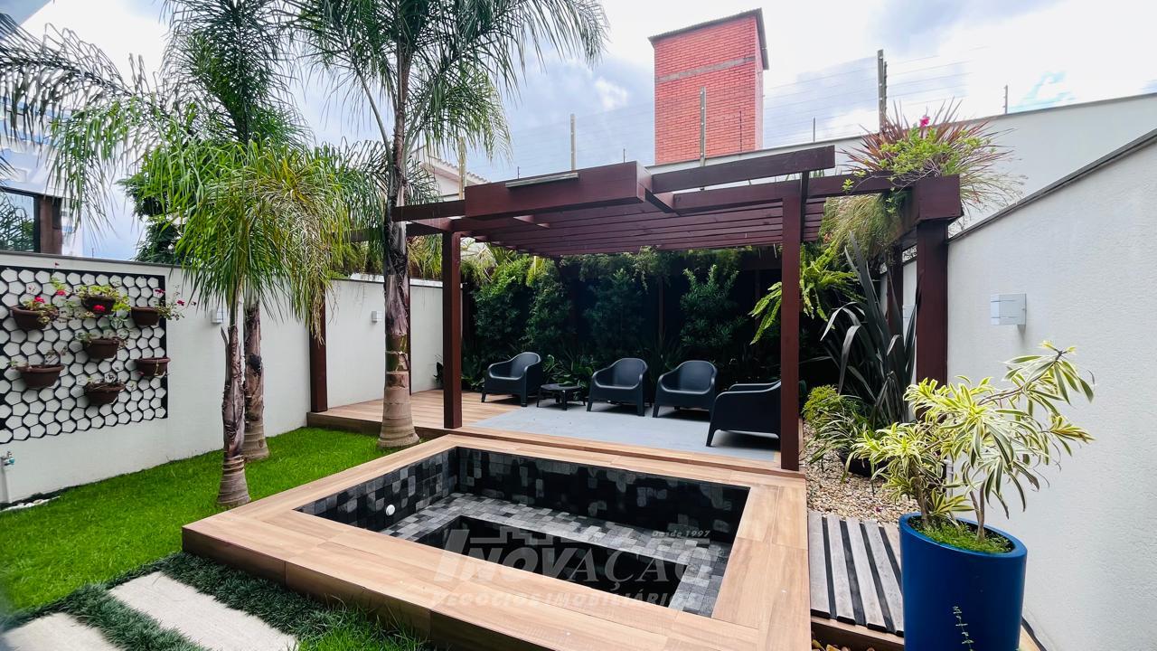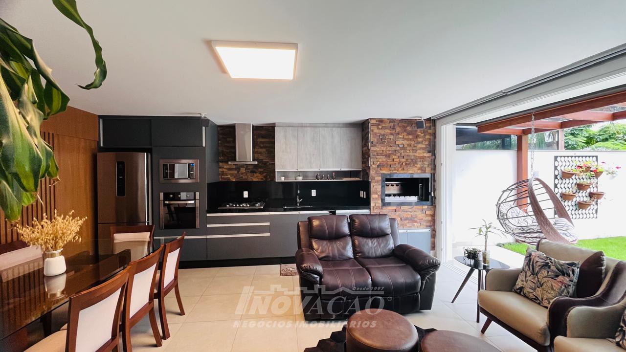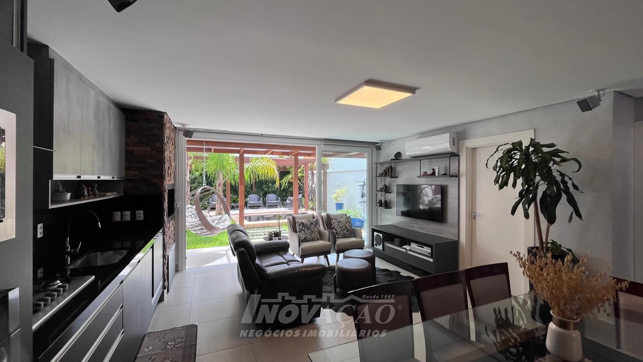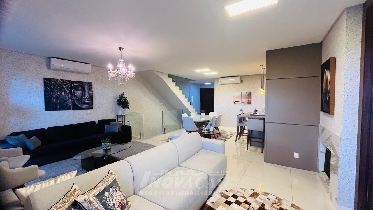 Imobiliária Inovação vende excelente casa com área privativa de 287,00m², em condomínio fechado, com 03 Suítes sendo 01 Máster com sacada e banheira. 1° pavimento possui amplo espaço gourmet, varanda, pátio com hidromassagem com cascata e pergolado, lavabo e área de serviço; 2° pavimento com amplo estar social com lareira e sacada, lavabo, escritório, sala de jantar e cozinha com bifeteira; 3° pavimento com dormitórios. A casa conta com abertura em PVC, vidro duplo, split e elevador. O condomínio possui portaria 24 horas, piscina, academia, salão de festas com sala de jogos.