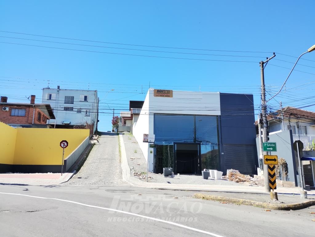 Inovação Negócios Imobiliários aluga em Caxias do Sul,, RS, no bairro Medianeira, loja térrea, sala comercial com 495,00m², cinco banheiros, vaga para quatro carros em frente mais estacionamento com seis vagas, piso em porcelanato, fachada em vidro com cortinas de aço automatizadas. A posição solar é Oeste, local de grande fluxo.