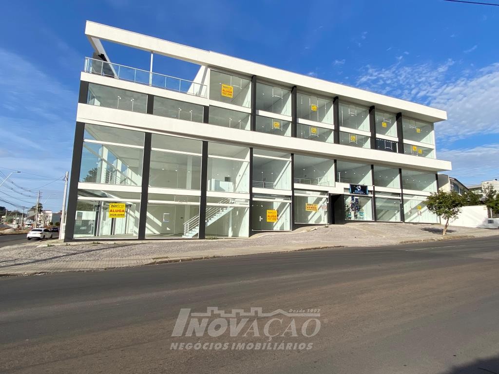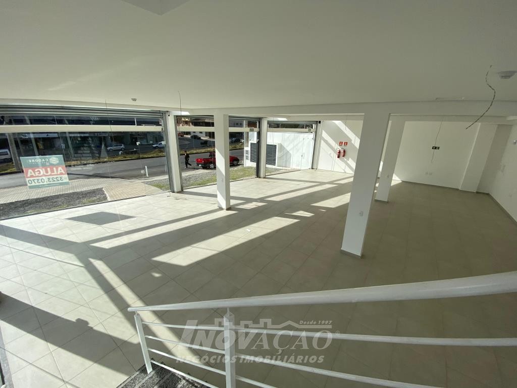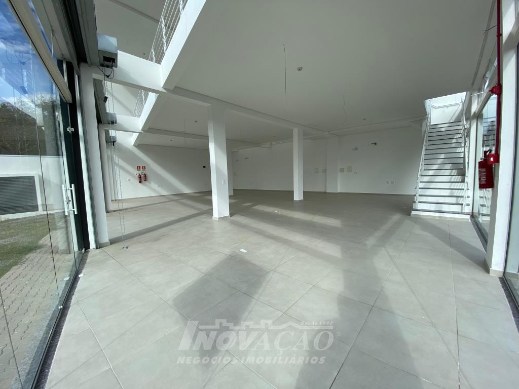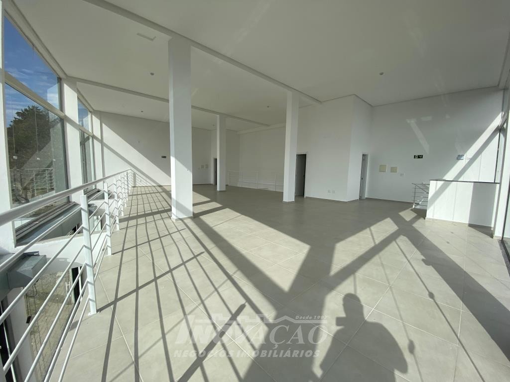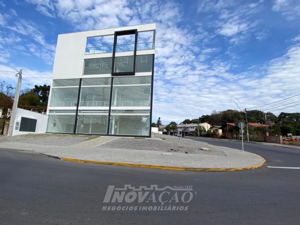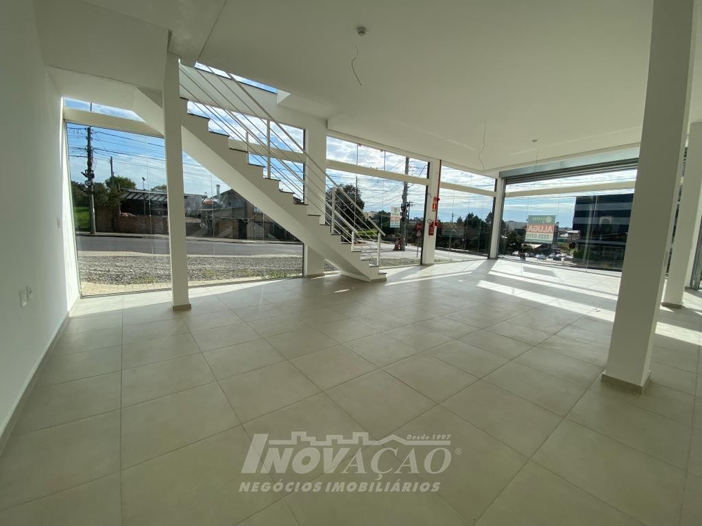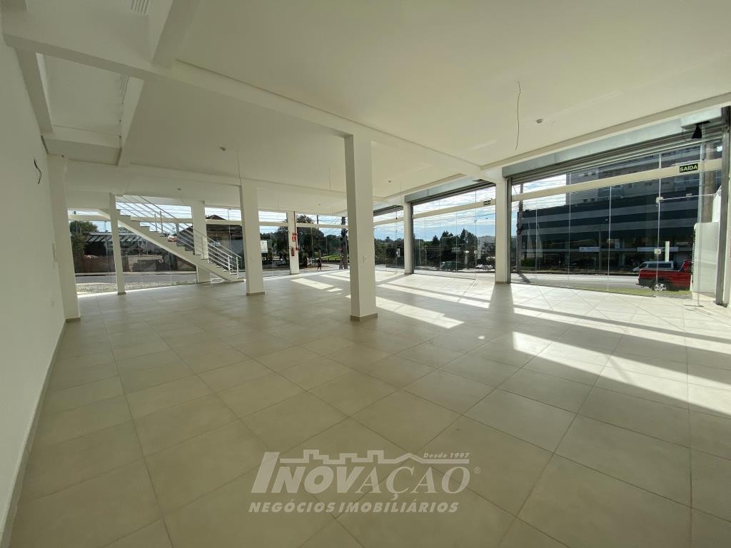 Inovação Negócios Imobiliários aluga em Caxias do Sul, RS, no bairro Desvio Rizzo Sala Térrea de esquina em via de Grande fluxo com fachada em vidro, Piso em Porcelanato, 3 Banheiros, Mezanino, cortinas de ferro automatizada Posição Solar oeste, Metragem 323m² .