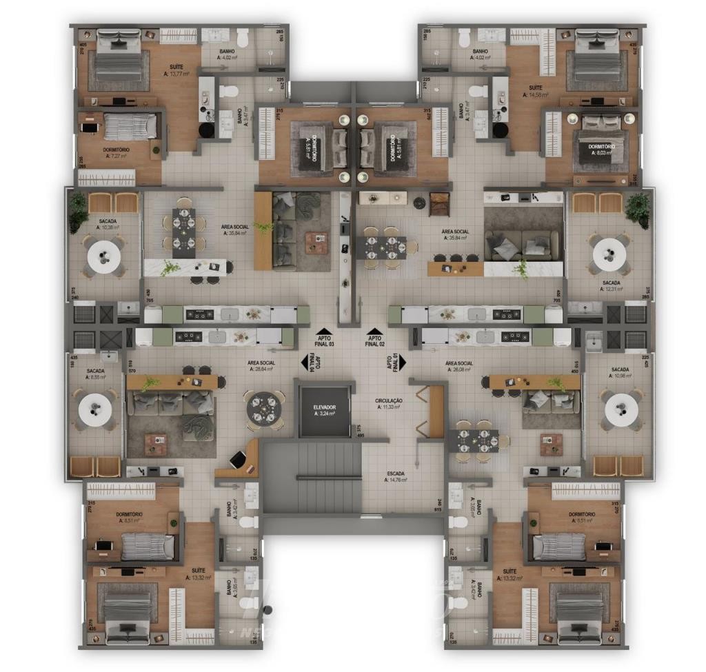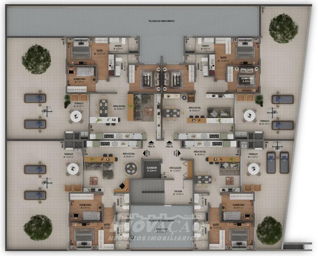 Inovação Negócios Imobiliários Ltda vende em Caxias do Sul no bairro Pio X, apartamento com dois dormitórios sendo um suíte, sala dois ambientes com sacada gourmet e churrasqueira, cozinha, área de serviço, banheiro social, piso em laminado e cerâmica, instalação de água quente, gás central, posição solar leste, oeste, garagem dupla. Esperas para climatização split, rebaixe de gesso em todo apartamento, esquadrias em pvc, iluminação em led nas áreas comuns, manta acústica entre os pavimentos. Elevador salão de festas decorado e mobiliado, hall de entrada decorado espaço kids, área para futebol, playground, ambiente de estar externo, estar do fogo, pet place, sistema de monitoramento, câmeras de segurança, excelente padrão de acabamento, acesso com tratamento paisagístico. Obs: Consultar outros apartamentos no prédio, com três dormitórios e com dois dormitórios. Entrega Julho de 2026