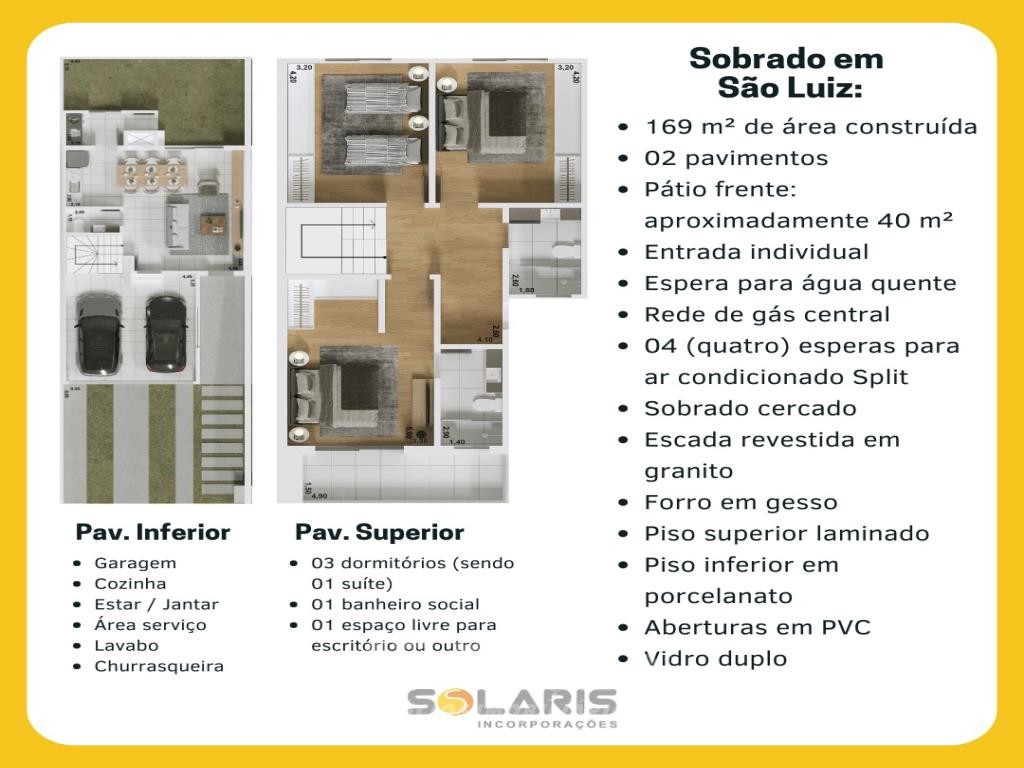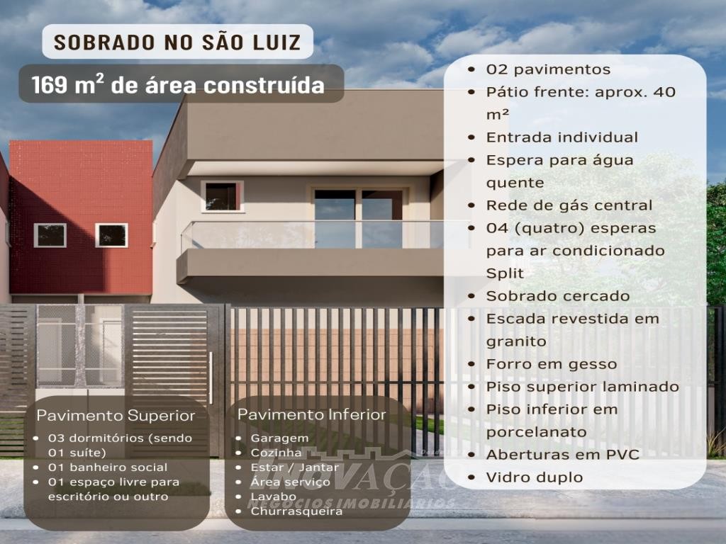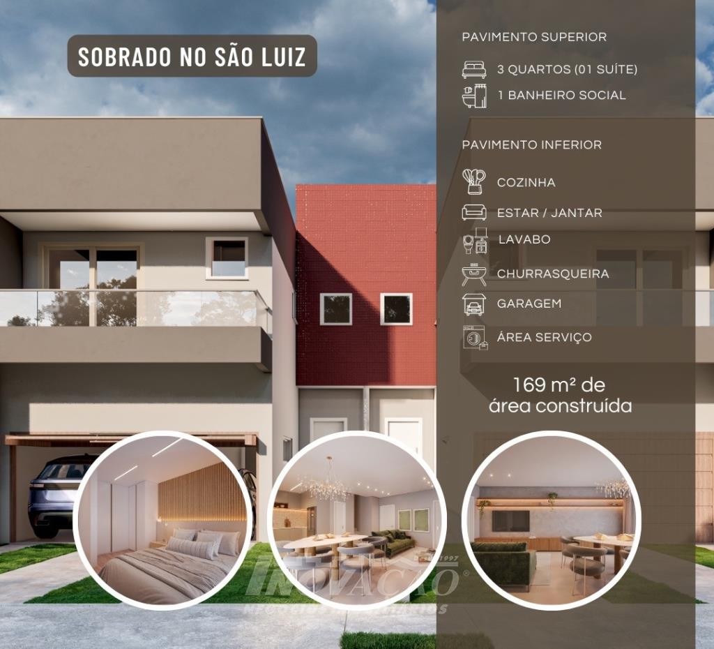 Inovação Negócios Imobiliários vende sobrados novos no bairro São Luíz em Caxias do Sul com 03 dormitórios, sendo 01 suíte com sacada, sala e cozinha integradas com churrasqueira, lavabo, lavanderia, pátio frontal e de fundos, garagem para 02 carros e entrada para água quente.